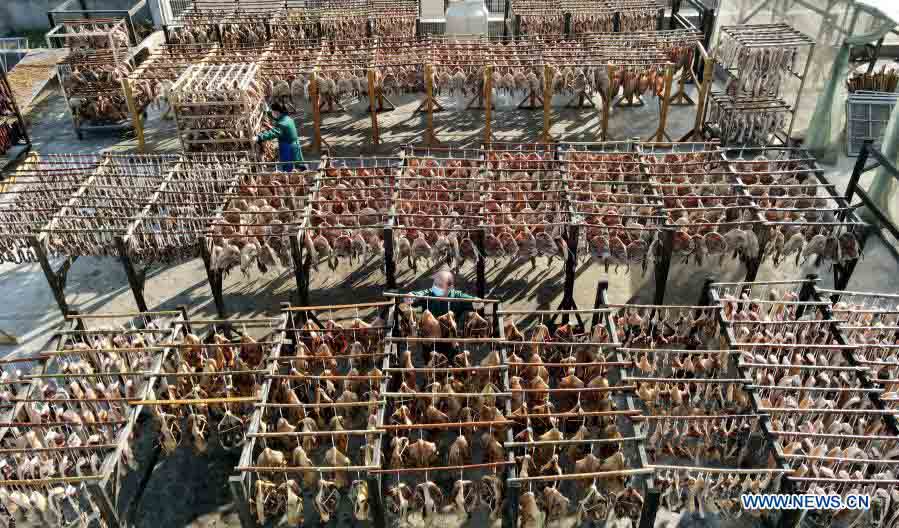 Aerial photo shows Ding Shengping sorting cured meat products at his factory in Shangpai Town of Feixi County, Hefei City, east China's Anhui Province, Jan. 13, 2021. Ding Shengping, 36, opened a small cured meat workshop at his hometown in Feixi County in 2012. From the product development to market promotion, Ding learned everything from scratch. After years of operation, his small workshop has been developed into a large-scale cured meat product processing factory. Last year, Ding's business suffered a brief blow due to the COVID-19 pandemic. However, things turned around quickly after he managed to develop more new products and begin to sale his cured meat both online and offline. In 2020, Ding's factory achieved over 10 million yuan (about 1.5 million U.S. dollars) in sales, also providing jobs for more than 20 local villagers. (Xinhua/Liu Junxi)