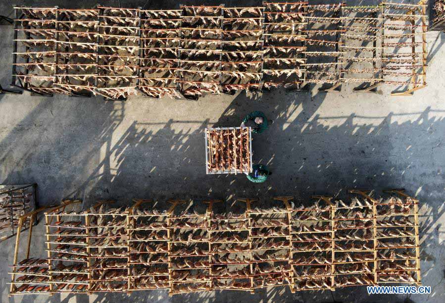 Aerial photo shows Ding Shengping (Rear) carrying cured meat products with his employee at his factory in Shangpai Town of Feixi County, Hefei City, east China's Anhui Province, Jan. 13, 2021. Ding Shengping, 36, opened a small cured meat workshop at his hometown in Feixi County in 2012. From the product development to market promotion, Ding learned everything from scratch. After years of operation, his small workshop has been developed into a large-scale cured meat product processing factory. Last year, Ding's business suffered a brief blow due to the COVID-19 pandemic. However, things turned around quickly after he managed to develop more new products and begin to sale his cured meat both online and offline. In 2020, Ding's factory achieved over 10 million yuan (about 1.5 million U.S. dollars) in sales, also providing jobs for more than 20 local villagers. (Xinhua/Liu Junxi)
