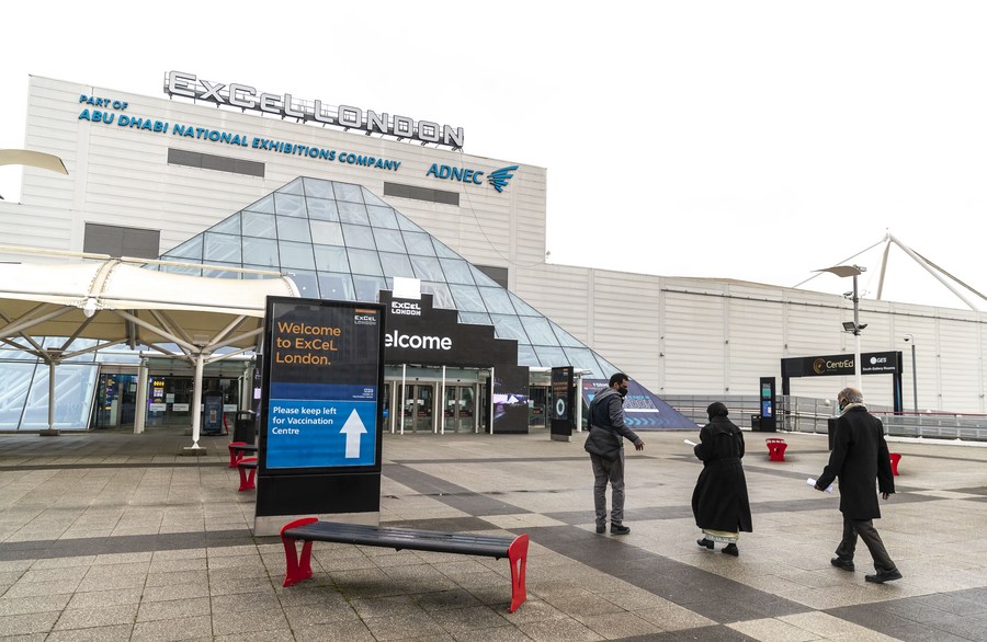 People wearing face masks walk into the Vaccination Center at ExCel exhibition center in London, Britain, Jan. 12, 2021. (Xinhua/Han Yan)