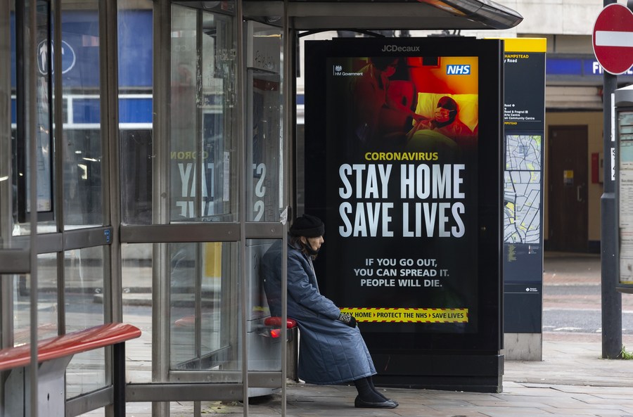 A person wearing a face mask sits next to an advertising board reading "Stay Home Save Lives" at a bus stop in London, Britain, Jan. 10, 2021. (Xinhua/Han Yan)