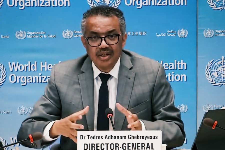 Photo taken in Brussels, Belgium on Aug. 6, 2020 shows World Health Organization (WHO) Director-General Tedros Adhanom Ghebreyesus attending an online press conference held in Geneva, Switzerland. (Xinhua/Zhang Cheng)