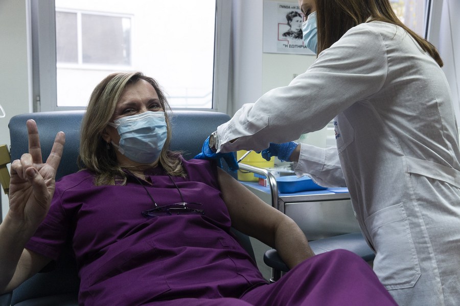 A health worker gets an injection of the COVID-19 vaccine at Sotiria Hospital in Athens, Greece, Dec. 27, 2020. (Xinhua/Marios Lolos)