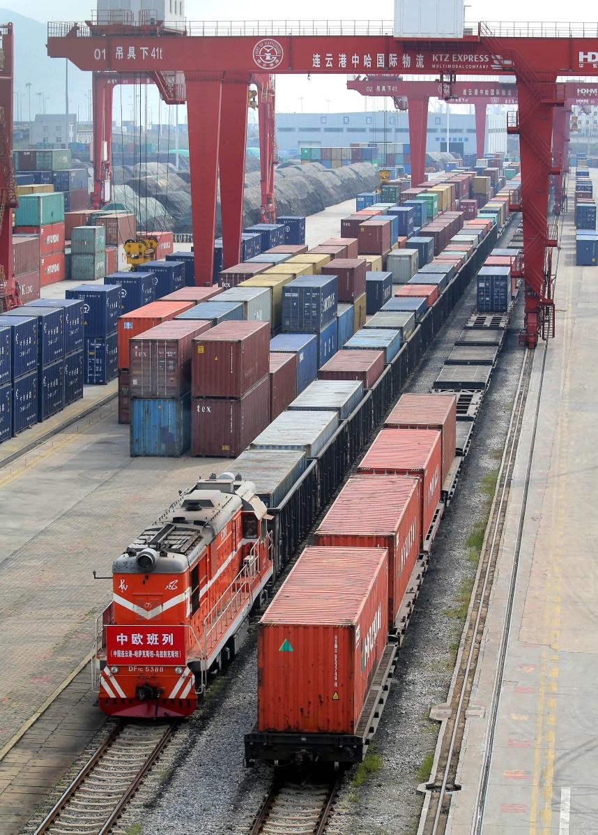 Photo taken on April 14, 2020, shows a China-Europe freight train loaded with 260,000 pieces of medical supplies departing from a China-Kazakhstan logistics cooperation base in Lianyungang, east China's Jiangsu province, for Central Asian countries. (People's Daily Online/Wang Jianmin)