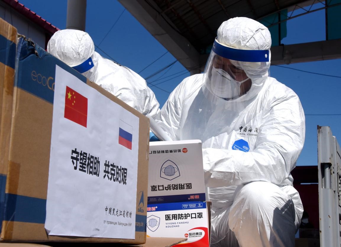 Customs officers in Heihe, northeast China's Heilongjiang province, clear a batch of anti-epidemic supplies to be donated to Russia, April 2, 2020. (People's Daily Online/Qiu Qilong)