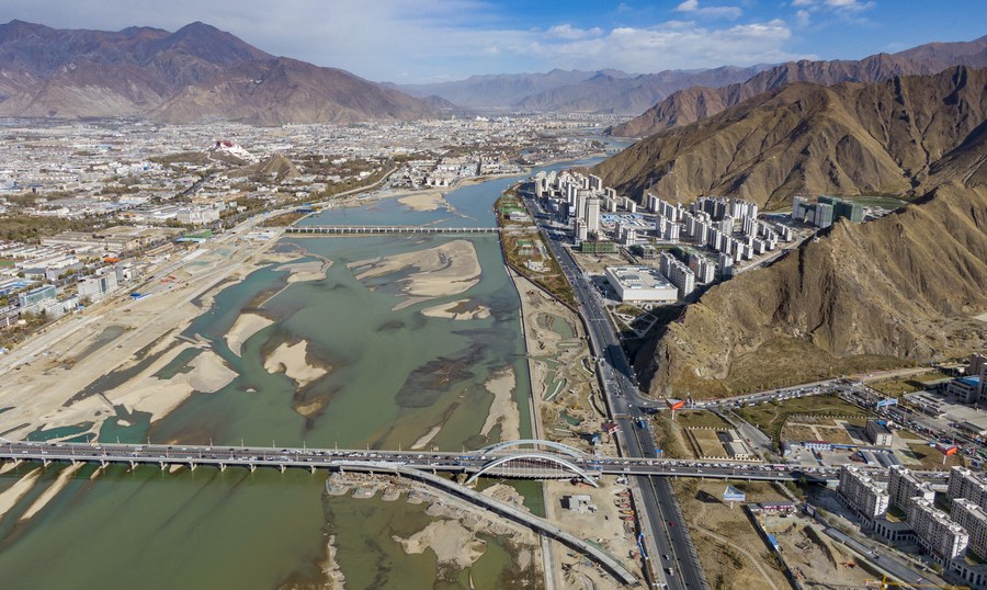 Aerial photo taken on Nov. 23, 2020 shows a view of Lhasa City, capital of southwest China's Tibet Autonomous Region. (Xinhua/Purbu Zhaxi)
