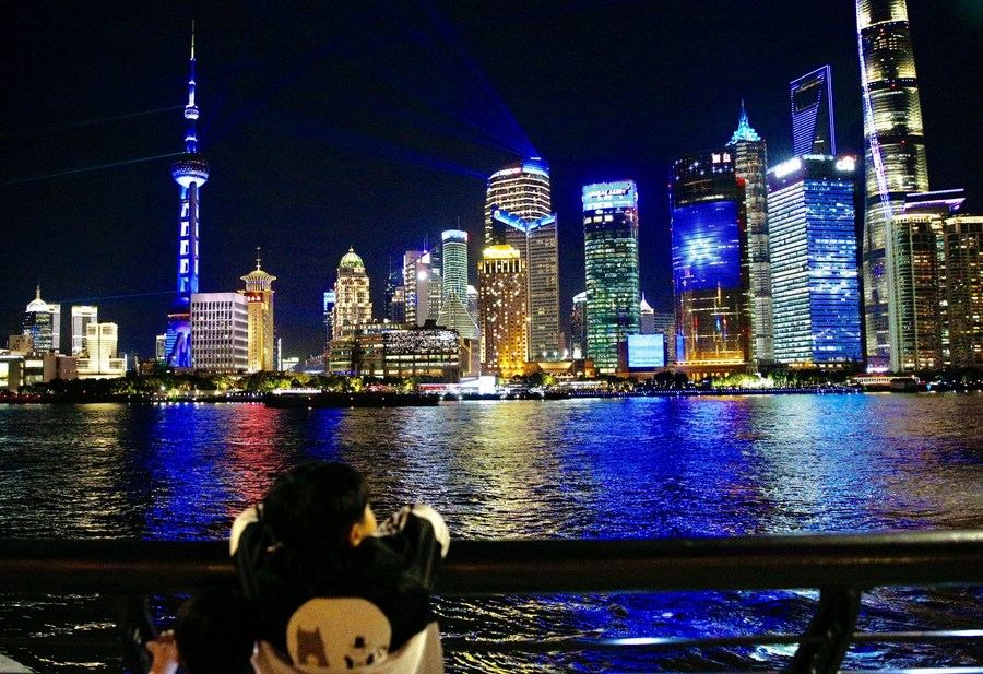 A child views a light show at the Bund in Shanghai, east China, Nov. 4, 2020. (Xinhua/Zhang Yuwei)