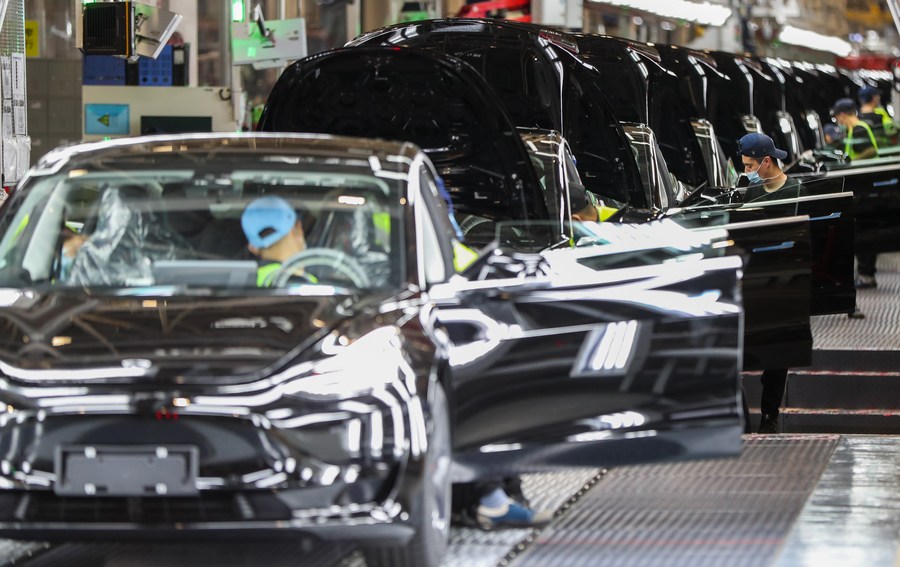 Employees work at the Tesla Gigafactory in Shanghai, east China, Nov. 20, 2020. (Xinhua/Ding Ting)