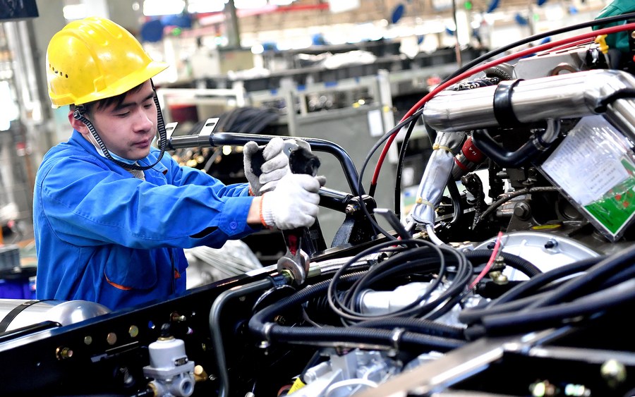 A worker is seen at a factory of the Shaanxi Automobile Holding Group in Xi'an, capital of northwest China's Shaanxi Province, Nov. 2, 2020. (Xinhua/Liu Xiao)