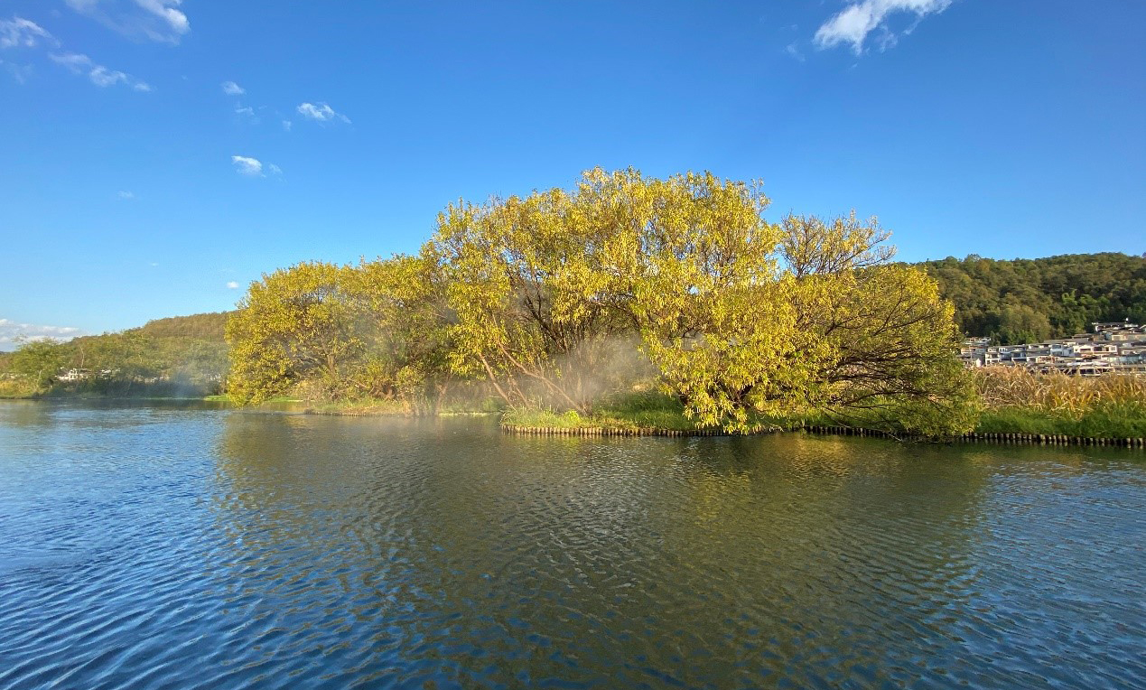 The reflection of a yellow-green tree melts into the shimmering river at Heshun Ancient Town, Tengchong County, southwest China's Yunnan Province, Dec. 7, 2020. (People's Daily Online/Meng Bin)