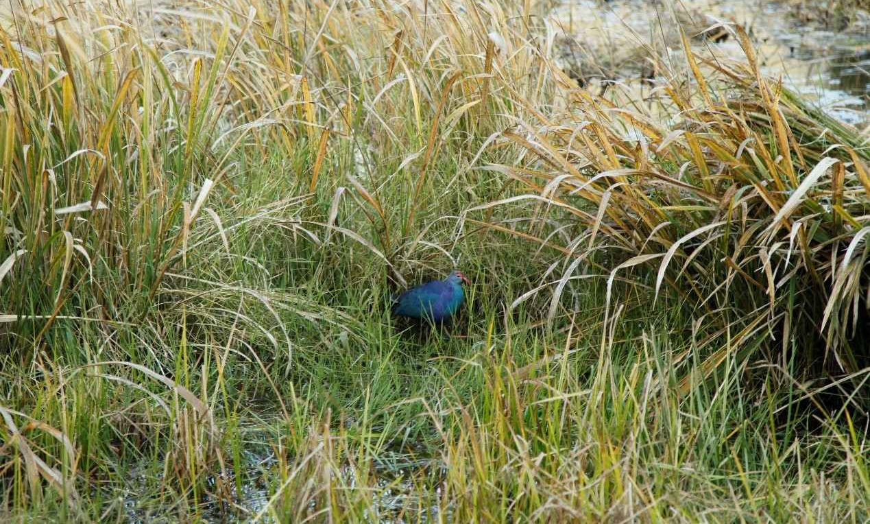 A purple swamphen, a protected bird, rests on marsh grass in Beihai Wetland, which is home to a host of protected animals and plants, Dec. 8, 2020. (People's Daily Online/Zhou Yu)
