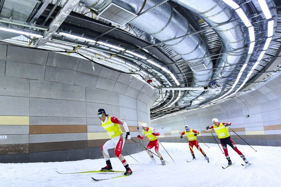 Photo shows the indoor Cross-Country Skiing training facilities in Jilin City, northeast China's Jilin Province, Oct. 1, 2020. (Xinhua/Xu Chang)