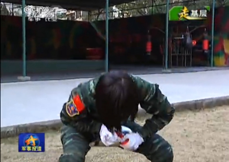 Photo shows a female SWAT member in Sichuan ripping apart a steel wash basin barehanded. Four hours physical training every day turns an ordinary woman into an invincible soldier. (Photo/CCTV)