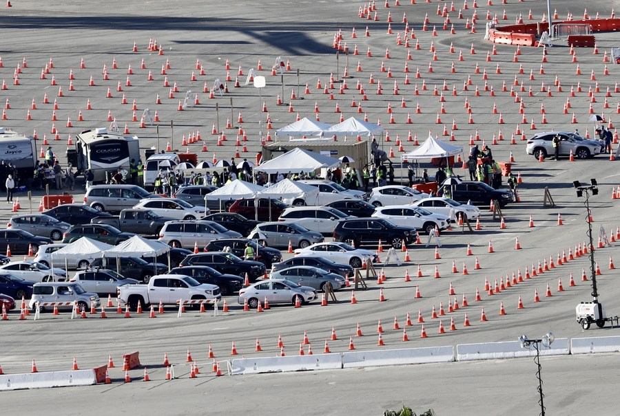 Motorists line up to receive inoculation at a COVID-19 vaccination site at Dodger Stadium in Los Angeles, California, the United States, Jan. 15, 2021. (Xinhua)