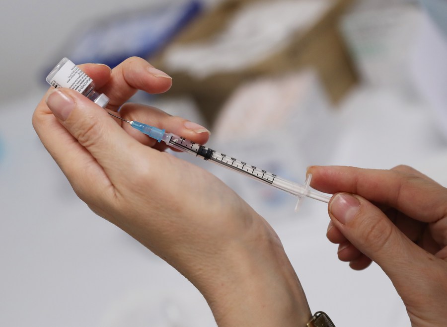 A nurse prepares a dose of COVID-19 vaccine at a temporary vaccination center on the first day of its opening, in Clichy, France, Jan. 18, 2021. (Xinhua/Gao Jing)