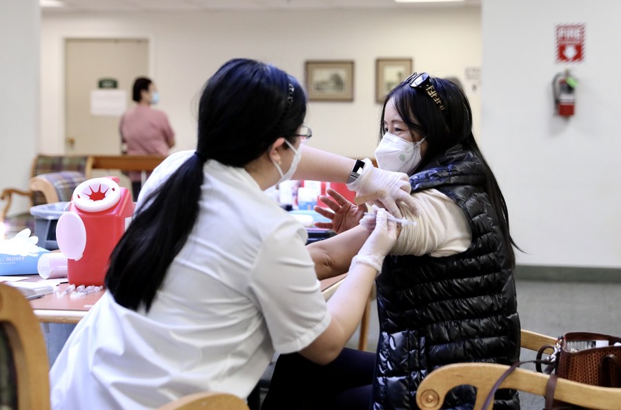 A resident receives a dose of COVID-19 vaccine in Pasadena, Los Angeles County, California, the United States, Jan. 15, 2021. (Xinhua)