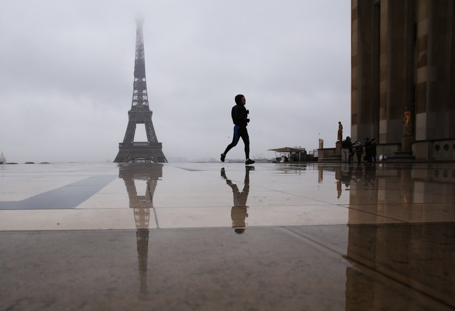 A man runs past the Place du Trocadero near the Eiffel Tower in Paris, France, Jan. 13, 2021. (Xinhua/Gao Jing)