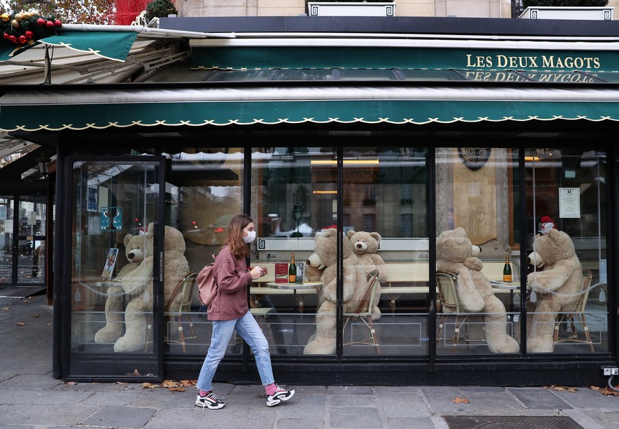 Giant teddy bears are seen at the closed Les Deux Magots cafe in Paris, France, Dec. 16, 2020. (Xinhua/Gao Jing)