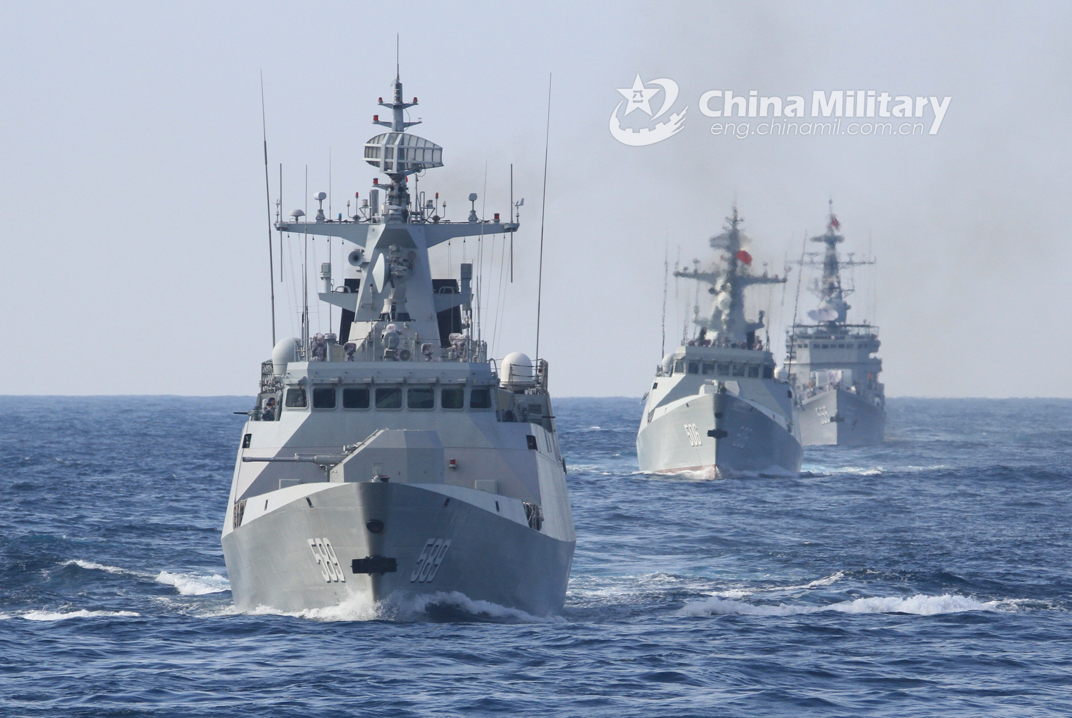 The frigate fleet, comprised of the guided-missile frigates Qingyun (Hull 589), Jingmen (Hull 506) and Zhaotong (Hull 555), steam in formation during a four-day maritime training exercise from January 22 to 25, 2021. They are attached to a frigate flotilla with the navy under the PLA Southern Theater Command. (eng.chinamil.com.cn/Photo by Cai Shengqiu)