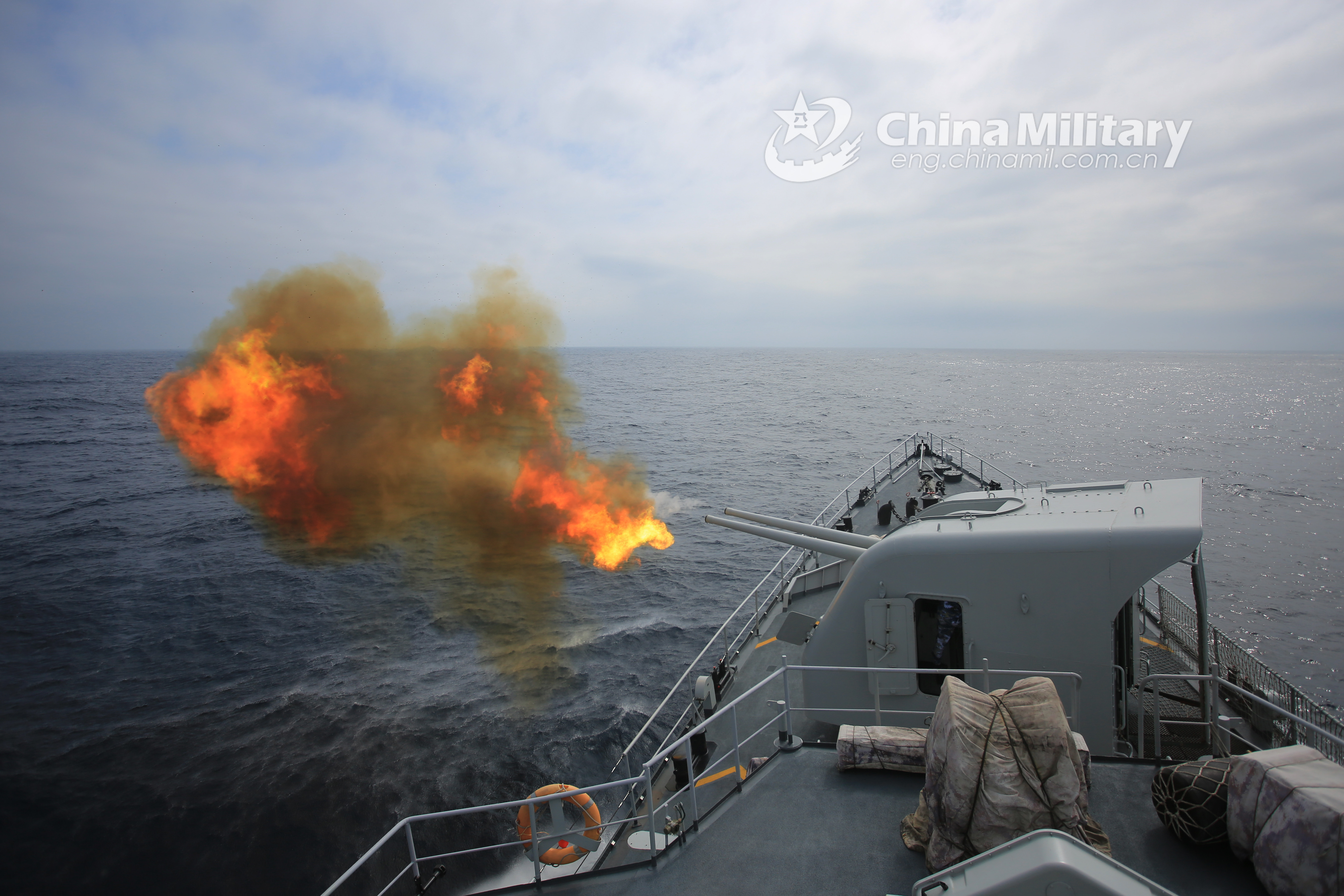 A frigate attached to a frigate flotilla with the navy under the PLA Southern Theater Command fires its main gun at mock sea targets during a four-day maritime training exercise from January 22 to 25, 2021. (eng.chinamil.com.cn/Photo by Cai Shengqiu)