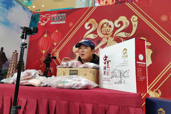 An online streamer sells products during a live streaming session held for the upcoming Spring Festival in Yinchuan, northwest China's Ningxia Hui Autonomous Region. (Photo/Xinhua)
