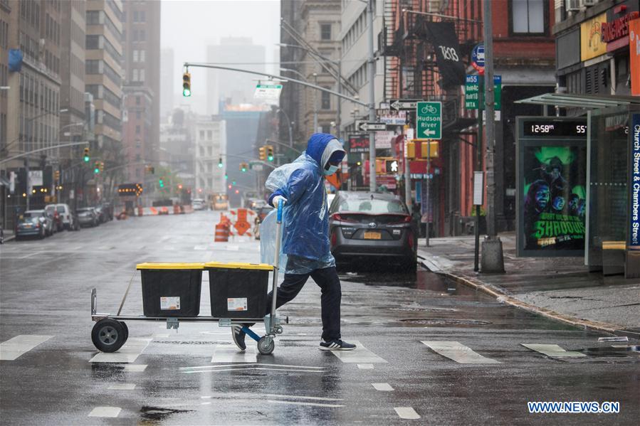 A worker wearing a mask delivers packages during the COVID-19 pandemic in New York, the United States, April 13, 2020. (Photo by Michael Nagle/Xinhua)