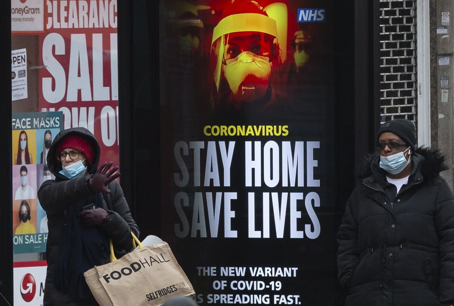 Passengers wearing face masks stand next to an advertising board reading "Stay Home Save Lives" at a bus stop in London, Britain, Jan. 10, 2021. (Xinhua/Han Yan)