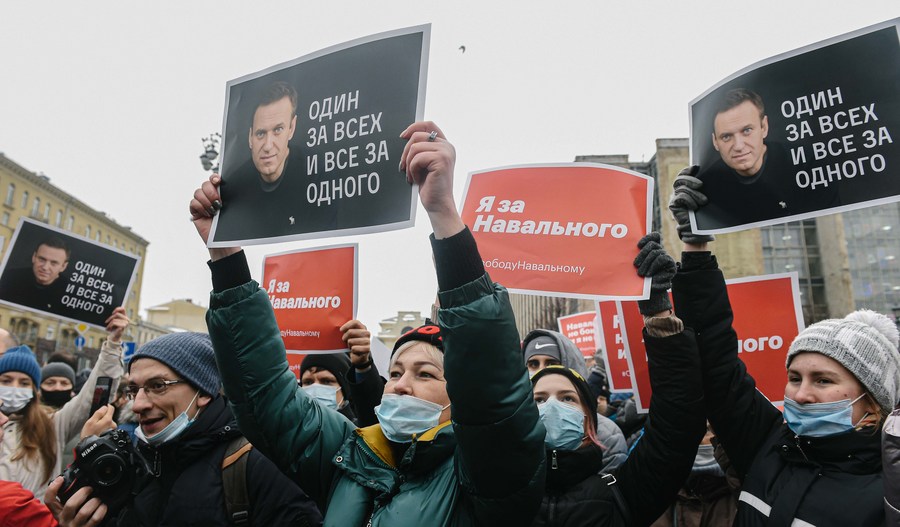 Protesters hold posters in support of detained Russian opposition leader Alexei Navalny during an unsanctioned rally at Pushkin Square in central Moscow on Jan. 23, 2021. (Xinhua/Evgeny Sinitsyn)