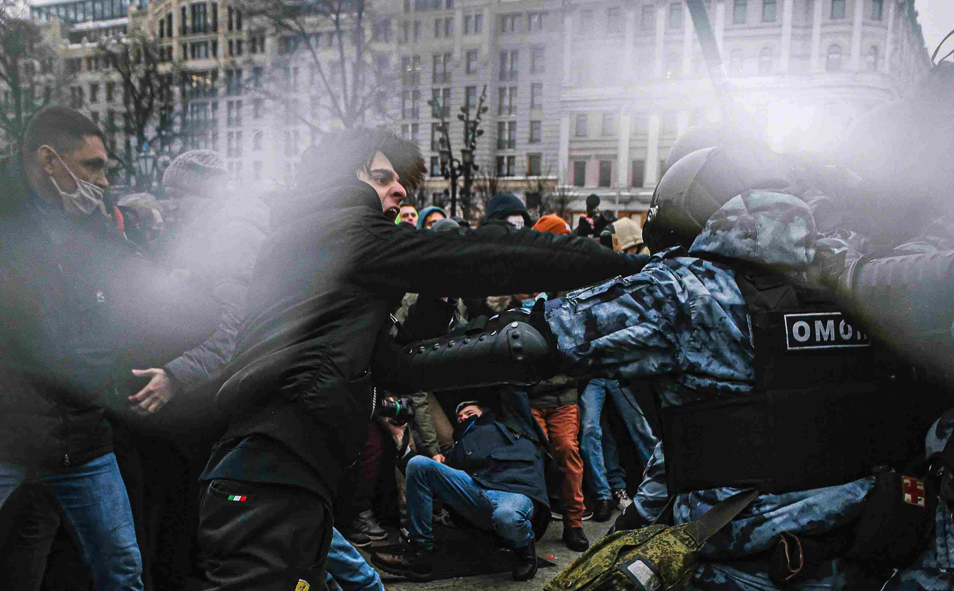 Supporters of detained Russian opposition leader Alexei Navalny clash with riot police officers during an unsanctioned rally in central Moscow on Jan. 23, 2021. (Xinhua/Evgeny Sinitsyn)