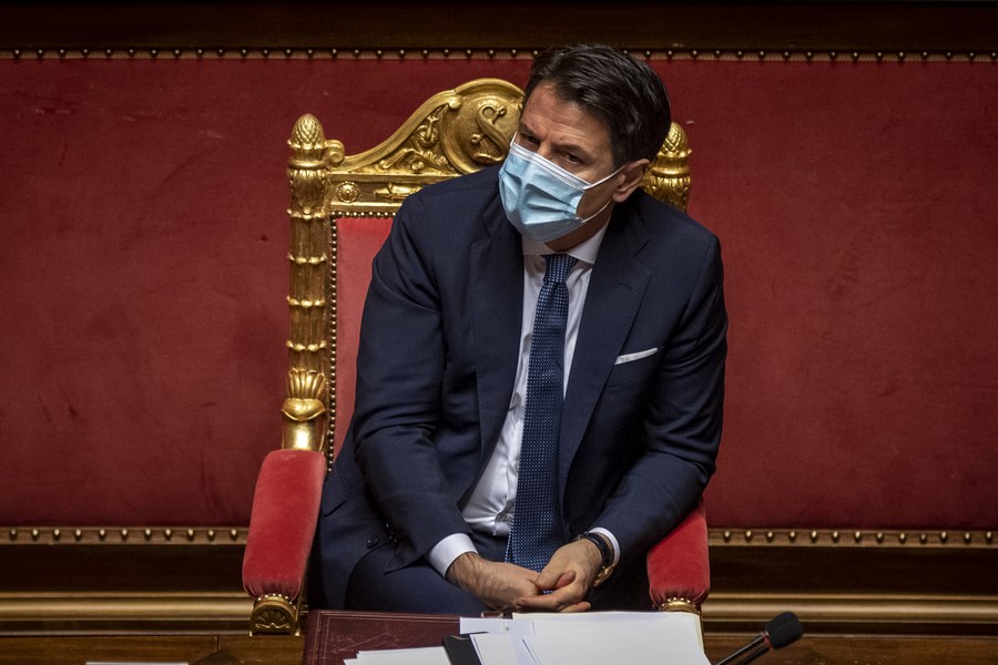 Italian Prime Minister Giuseppe Conte attends a debate ahead of a confidence vote in Senate in Rome, Italy, Jan. 19, 2021. (Pool via Xinhua)