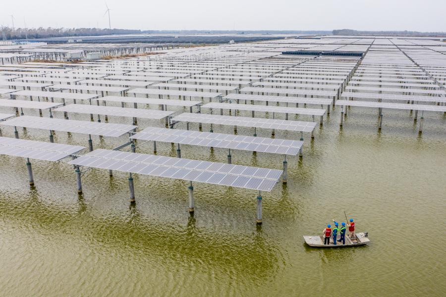 Electricians check photovoltaic solar panels in Sheyanghu Township of Baoying County, east China's Jiangsu Province, Nov. 5, 2020. (Xinhua/Li Bo)