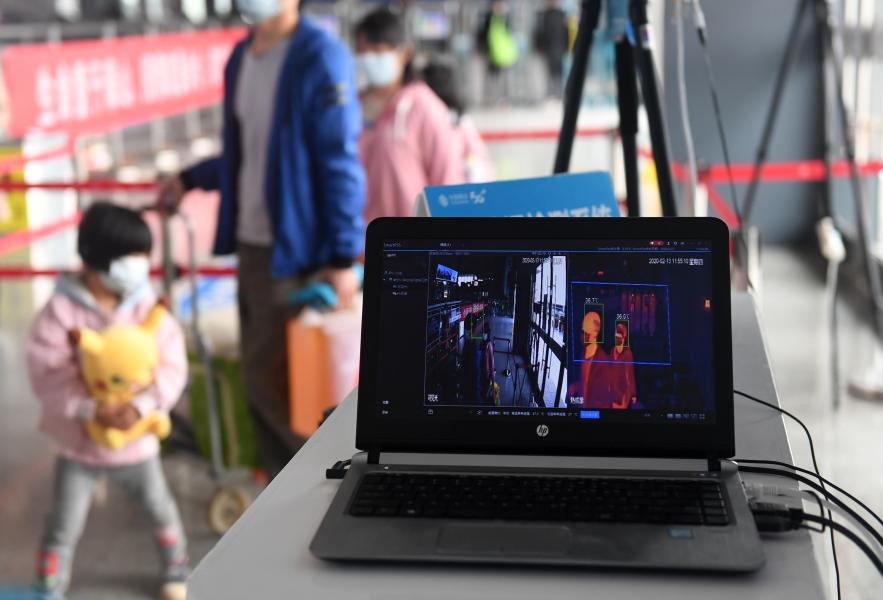 Passengers' body temperature information is displayed on the monitor of a 5G body temperature screening system at Nanning East Railway Station in Nanning City, south China's Guangxi Zhuang Autonomous Region, Feb. 13, 2020. (Xinhua/Lu Boan)