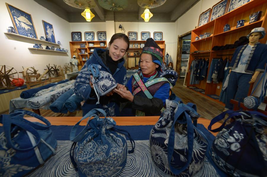 A sales assistant (L) and a resident relocated from a poverty-stricken area observe a batik product at a batik workshop in Danzhai County of Guizhou Province in southwest China, Dec. 1, 2020. (Xinhua/Yang Ying)