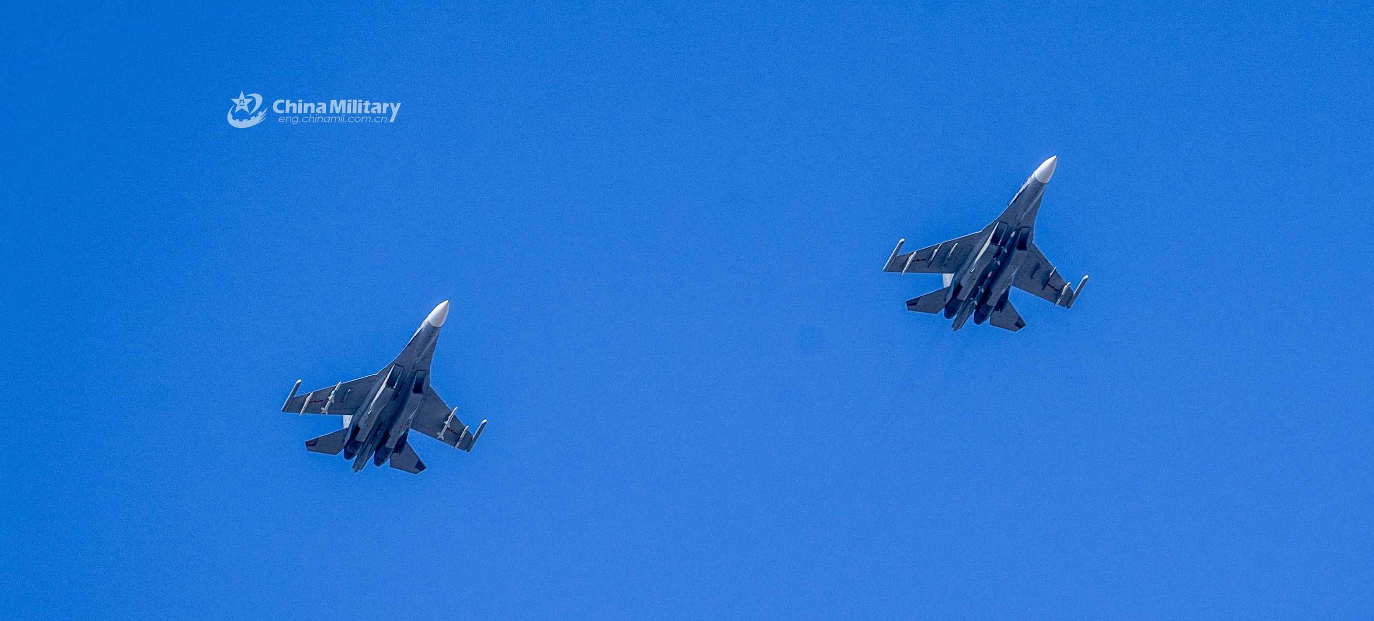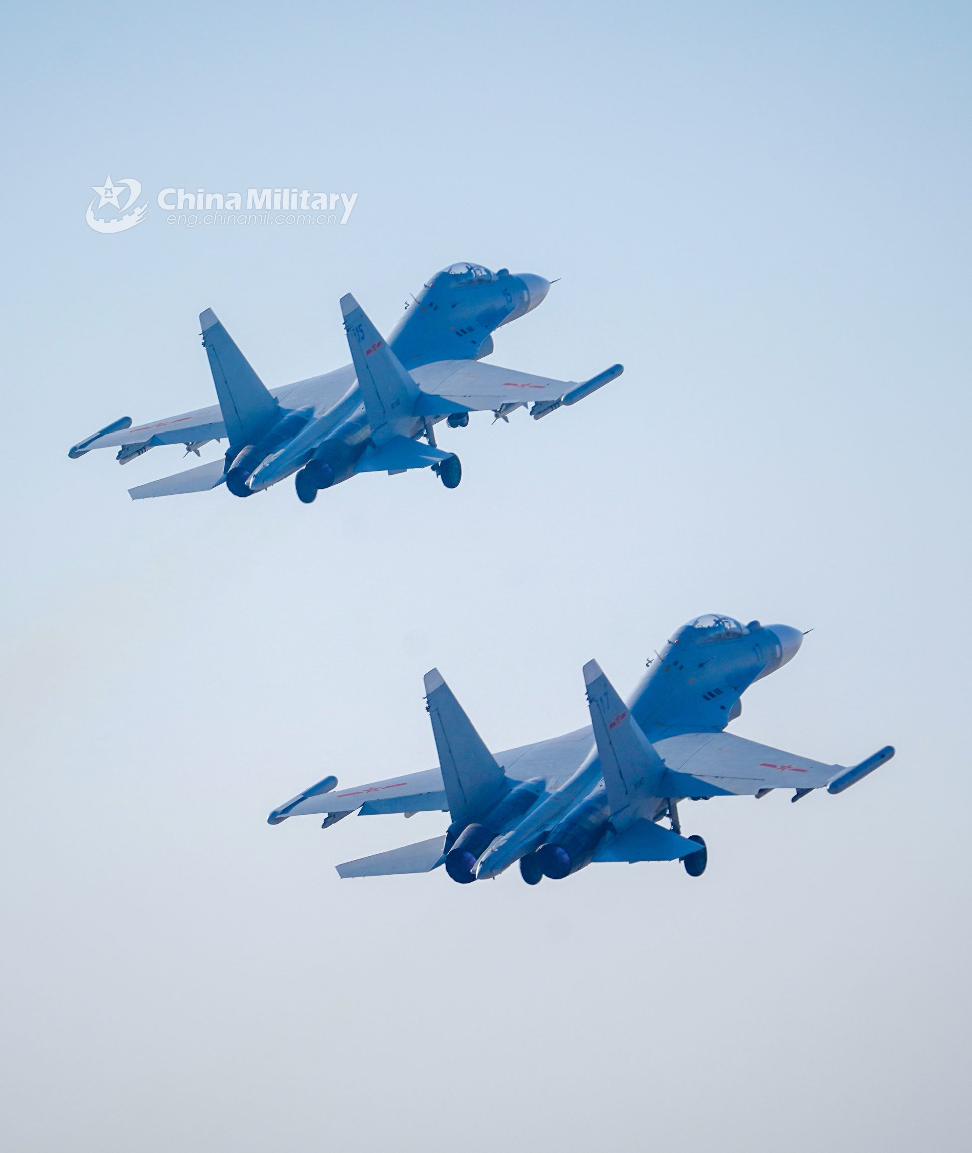 Two fighter jets attached to a naval aviation brigade under the PLA Eastern Theater Command fly in formation during a round-the-clock flight training exercise in mid January, 2021. (eng.chinamil.com.cn/Photo byTian Jianmin)