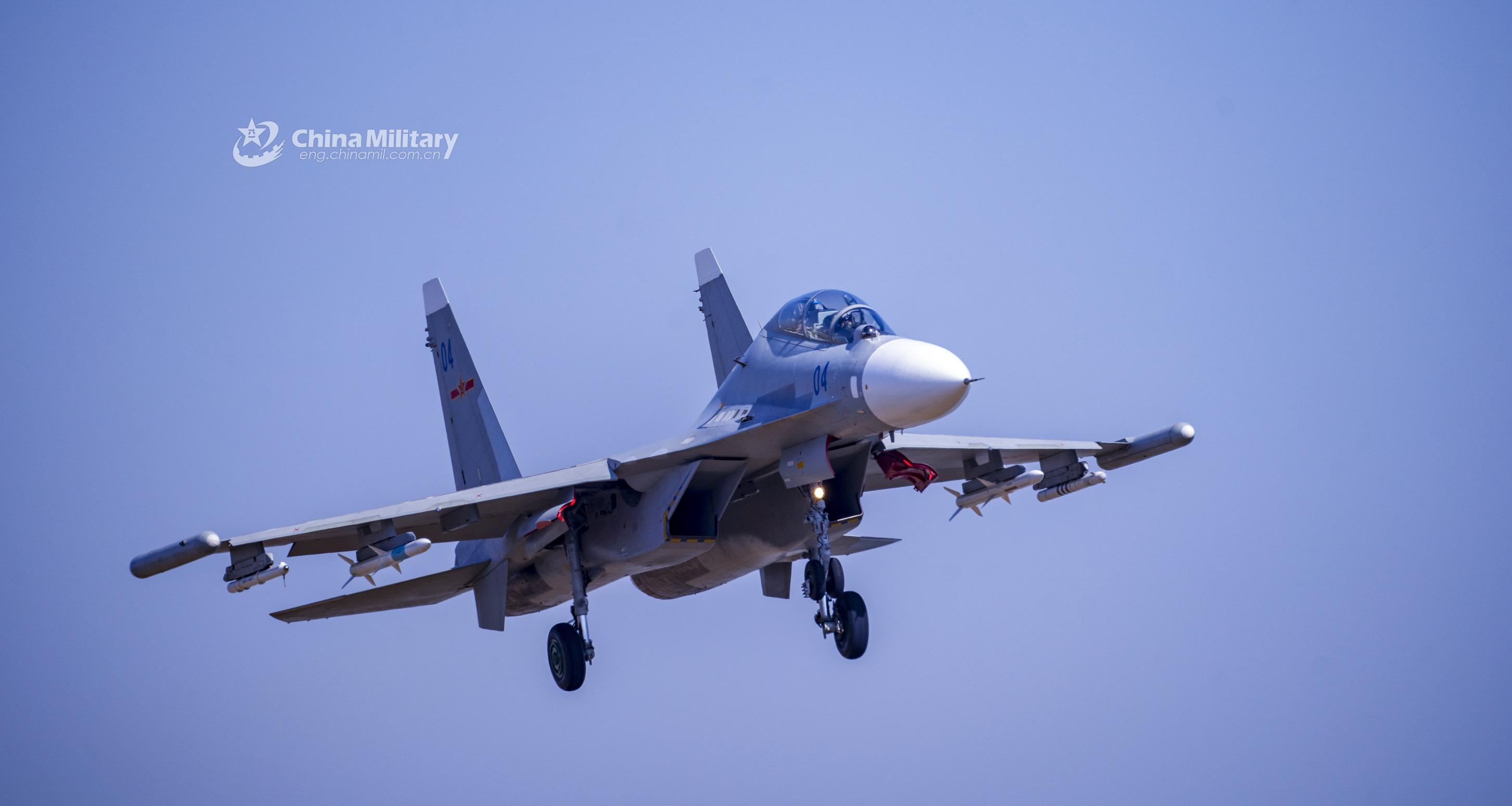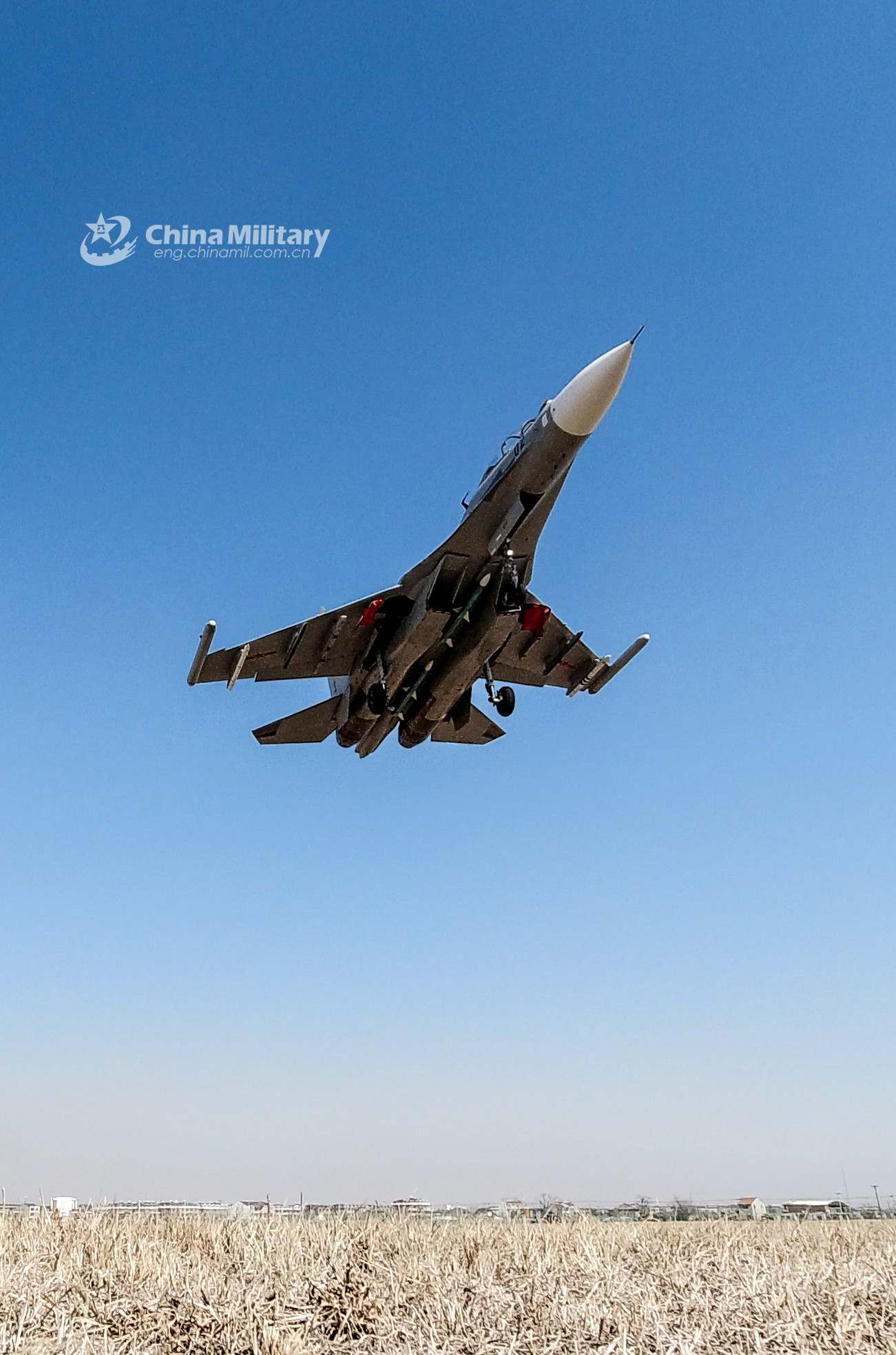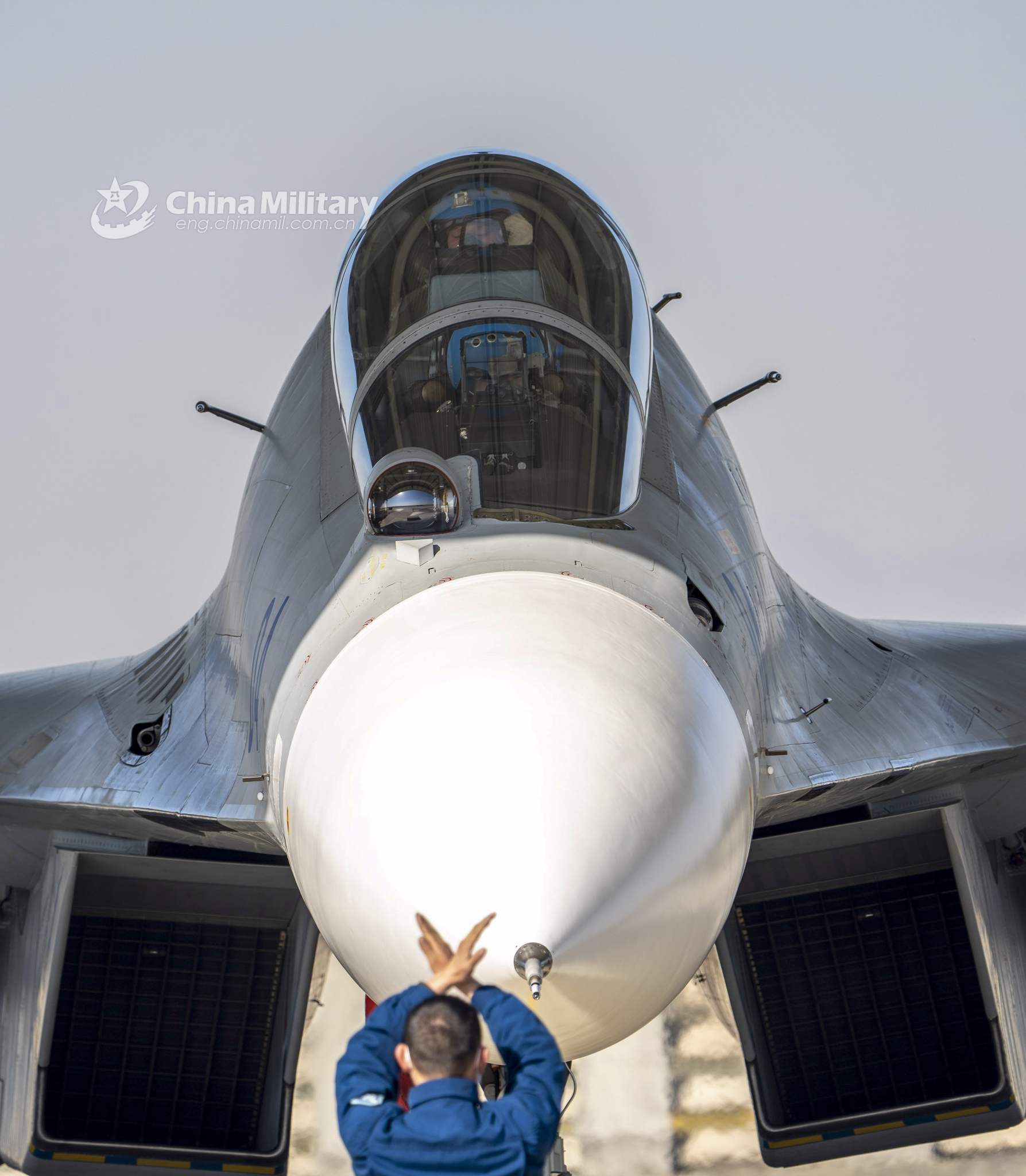 A fighter jet attached to a naval aviation brigade of the air force under the PLA Eastern Theater Command takes off during a round-the-clock flight training exercise in mid January, 2021. (eng.chinamil.com.cn/Photo by Tian Jianmin)