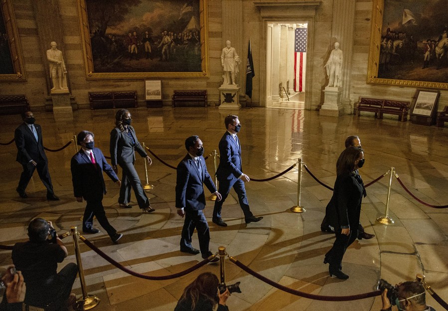 Impeachment managers walk through the Capitol Rotunda to deliver the article of impeachment for "incitement of insurrection" against former President Donald Trump to the Senate floor in Washington, D.C., the United States, Jan. 25, 2021. (Photo by Aaron Schwartz/Xinhua)