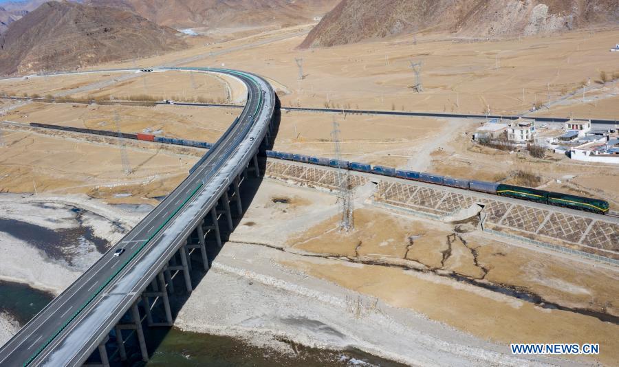 Aerial photo taken on Jan. 28, 2021 shows a section of the Lhasa-Nagqu high-grade highway and the Qinghai-Tibet railway crossing each other in southwest China's Tibet Autonomous Region. The road network in Tibet Autonomous Region now stretches over 117,000 km, up 50 percent from the end of 2015, as the region continues to see improving connectivity. The mileage of the rail network in the region has reached 954 km, according to data released recently. Since late 2012, China has been strengthening its infrastructure investment in Tibet. So far, roads have connected 95 percent of the township-level administrations and 75 percent of the incorporated villages in the region. (Xinhua/Purbu Zhaxi)