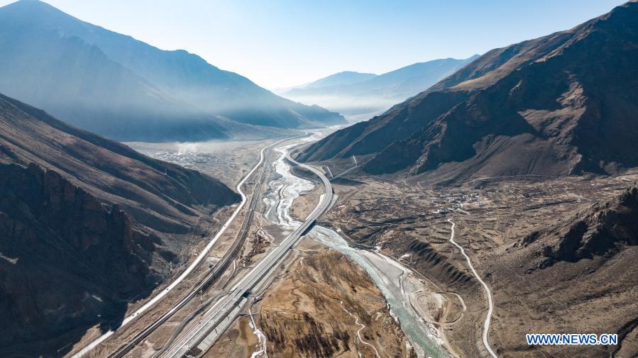 Aerial photo taken on Jan. 28, 2021 shows a section of the No.109 national highway, the Qinghai-Tibet railway, a high-grade highway and a village-level road (L to R) between Lhasa and Nagqu in southwest China's Tibet Autonomous Region. The road network in Tibet Autonomous Region now stretches over 117,000 km, up 50 percent from the end of 2015, as the region continues to see improving connectivity. The mileage of the rail network in the region has reached 954 km, according to data released recently. Since late 2012, China has been strengthening its infrastructure investment in Tibet. So far, roads have connected 95 percent of the township-level administrations and 75 percent of the incorporated villages in the region. (Xinhua/Jigme Dorje)
