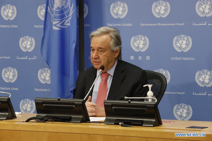 UN Secretary-General Antonio Guterres speaks during a press conference at the UN headquarters in New York, on Feb. 5, 2021. Guterres on Friday welcomed the agreement on a new interim executive authority for Libya. (Xinhua/Xie E)