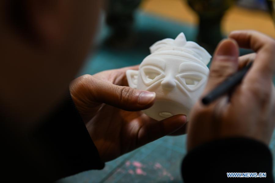 Zeng Zhou makes a toy figure at his workshop in Chengdu, southwest China's Sichuan Province, Feb. 4, 2021. Zeng Zhou is a 31-year-old independent designer working on toy figure design. Inspired by a visiting experience at Sanxingdui Museum in Sichuan, Zeng decided to design model figures imitating bronze relics of the Sanxingdui Ruins, which are believed to be remnants of the Shu Kingdom dating back 2,600 years to 4,800 years, blending traditional Chinese culture with fashion toys. Zeng Zhou is now dedicated to optimizing his design and promoting mass production of his toy figures. "I hope more collections of cultural relics of our country could be displayed by means of trendy, stylish designs," Zeng Zhou said. (Xinhua/Wang Xi)