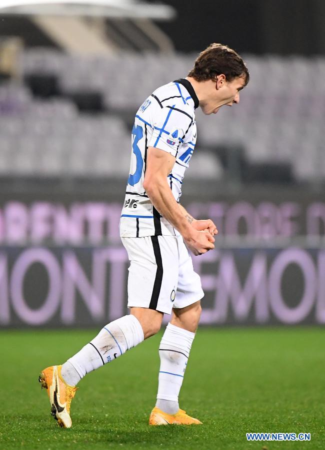 Inter's Nicolo Barella celebrates his goal during a serie A football match between Fiorentina and FC Inter in Florence, Italy, Feb. 5, 2021. (Xinhua/Alberto Lingria)