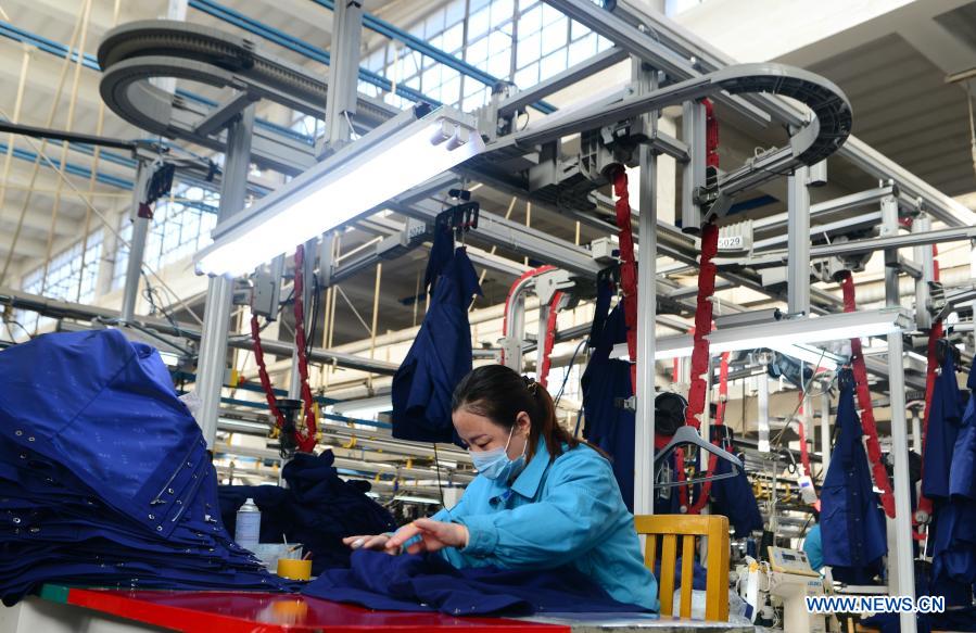 A worker operates on a production line at a garment factory in Jingxing County, Shijiazhuang City of north China's Hebei Province, Feb. 5, 2021. Recently Shijiazhuang Tax Service has carried out preferential tax policies to help local enterprises recover from the effect of the COVID-19 epidemic. (Xinhua/Jin Haoyuan)