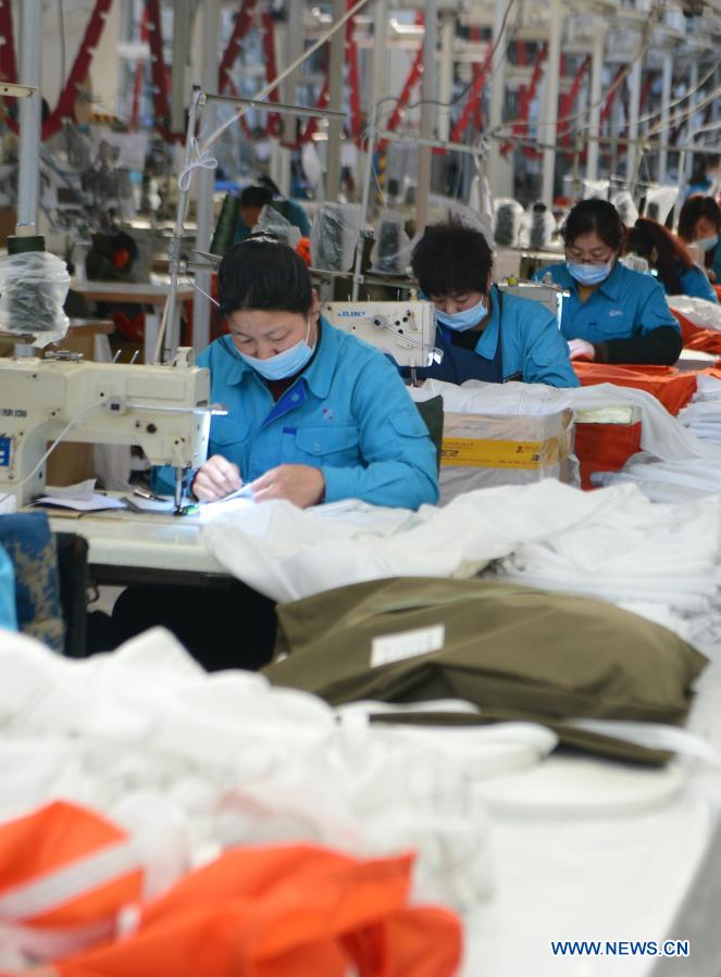 Workers operate on a production line at a garment factory in Jingxing County, Shijiazhuang City of north China's Hebei Province, Feb. 5, 2021. Recently Shijiazhuang Tax Service has carried out preferential tax policies to help local enterprises recover from the effect of the COVID-19 epidemic. (Xinhua/Jin Haoyuan)