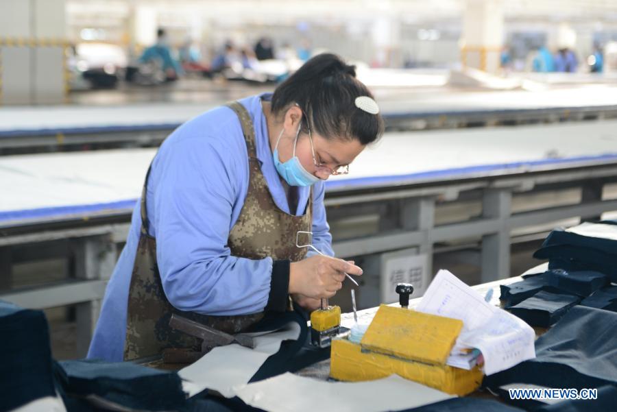 A worker operates on a production line at a garment factory in Jingxing County, Shijiazhuang City of north China's Hebei Province, Feb. 5, 2021. Recently Shijiazhuang Tax Service has carried out preferential tax policies to help local enterprises recover from the effect of the COVID-19 epidemic. (Xinhua/Jin Haoyuan)