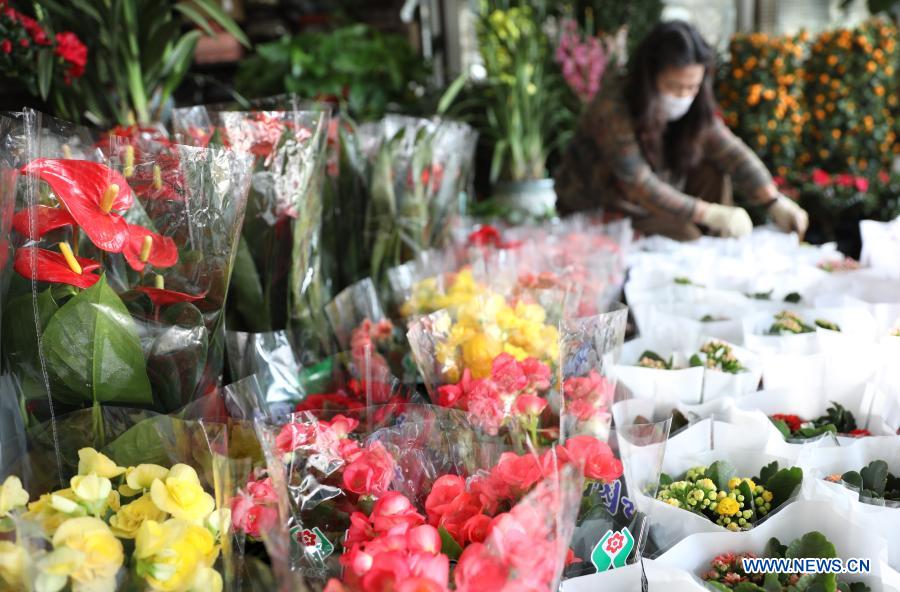A customer selects flowers at a flower market in Tiexi District of Anshan, northeast China's Liaoning Province, Feb. 5, 2021. Flowers become popular among local customers as the Spring Festival draws near. (Xinhua/Yao Jianfeng)