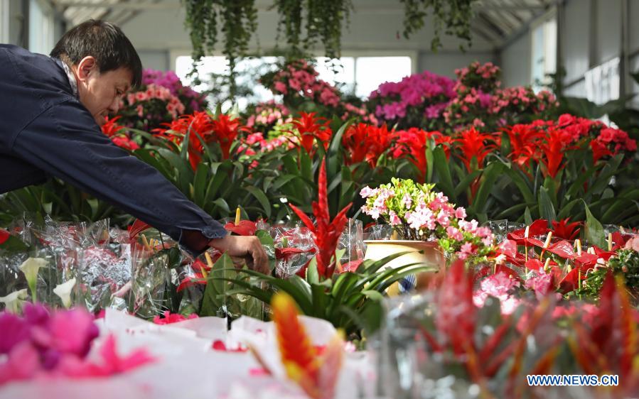 A customer selects flowers at a flower market in Tiexi District of Anshan, northeast China's Liaoning Province, Feb. 5, 2021. Flowers become popular among local customers as the Spring Festival draws near. (Xinhua/Yao Jianfeng)