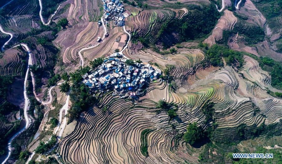 Aerial photo taken Feb. 4, 2021 shows a village surrounded by Hani terraced fields in Sancun Township of Honghe County, southwest China's Yunnan Province. (Xinhua/Chen Xinbo)