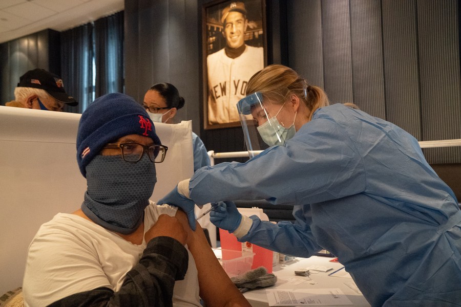 A man receives COVID-19 vaccine in the mass vaccination site at Yankee Stadium in the Bronx borough of New York, the United States, Feb. 5, 2021. (Don Pollard/Office of Governor Andrew Cuomo/Handout via Xinhua)