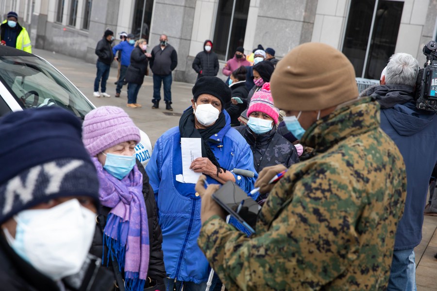 People register with National Guard members outside the mass vaccination site at Yankee Stadium in the Bronx borough of New York, the United States, Feb. 5, 2021. (Photo by Michael Nagle/Xinhua)