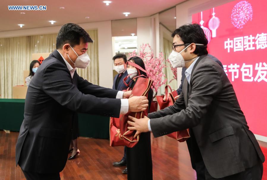Chinese Ambassador to Germany Wu Ken distributes Spring Festival kits in Berlin, Germany, Feb. 5, 2021. Chinese embassies and other diplomatic representations all over the world have been distributing Spring Festival kits containing items for epidemic prevention and other daily supplies to local Chinese communities as the Chinese New Year of the Ox draws near. (Xinhua/Shan Yuqi)
