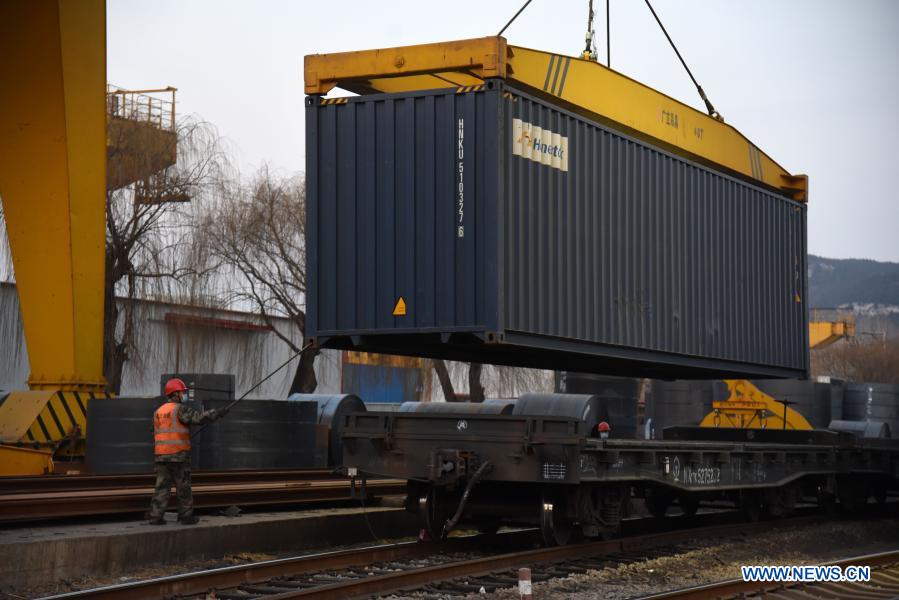 Staff members arrange the loading of "Qilu" freight train in east China's Shandong Province, Feb. 8, 2021. In January 2021, 118 trips of "Qilu" freight train were made, up 45.7 percent year on year. The value of exports and imports via the train services was about 1.3 billion yuan (201.5 million U.S. dollars), up 205.2 percent year on year, according to the service operator Shandong High-speed Group. (Xinhua/Wang Kai)